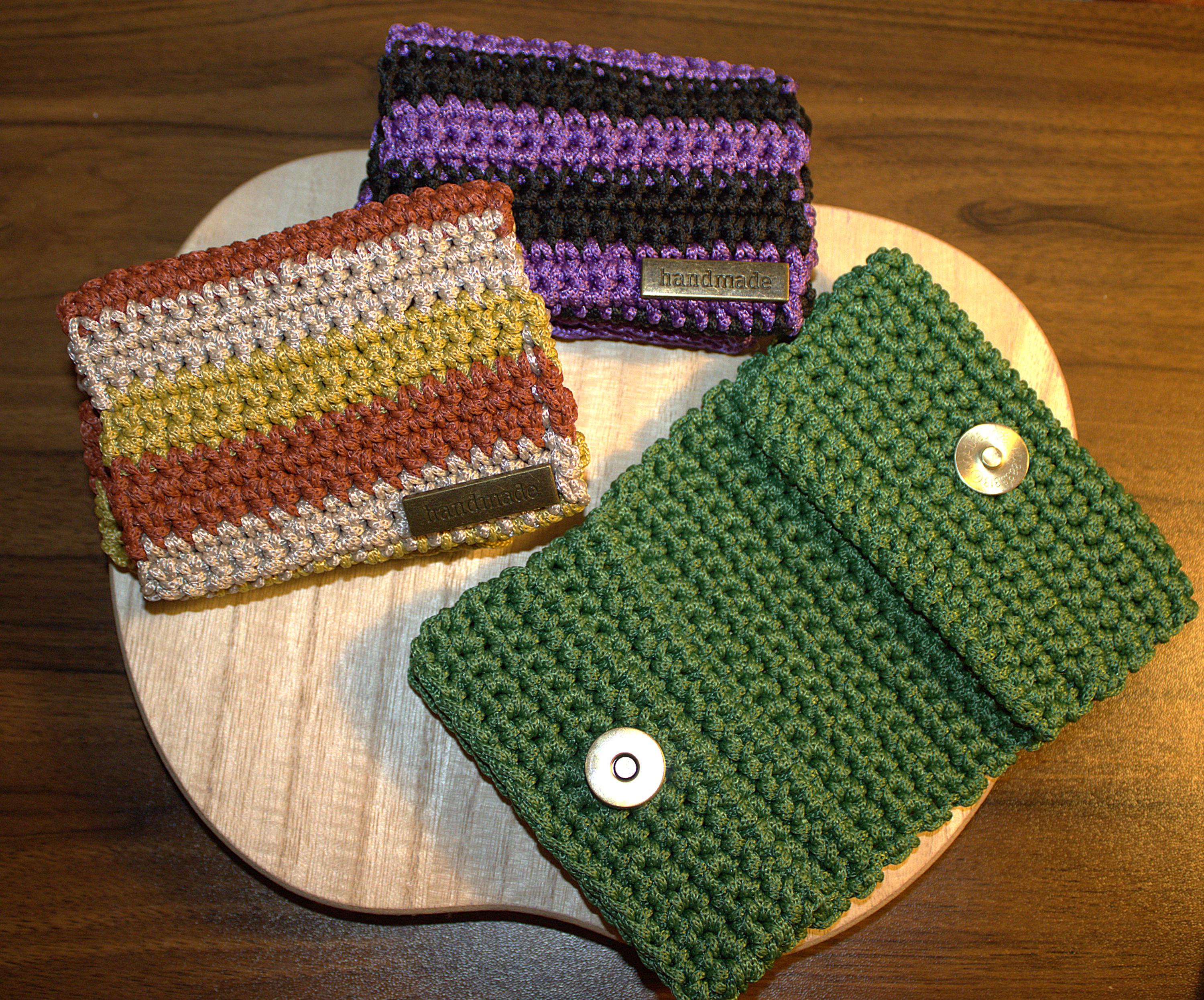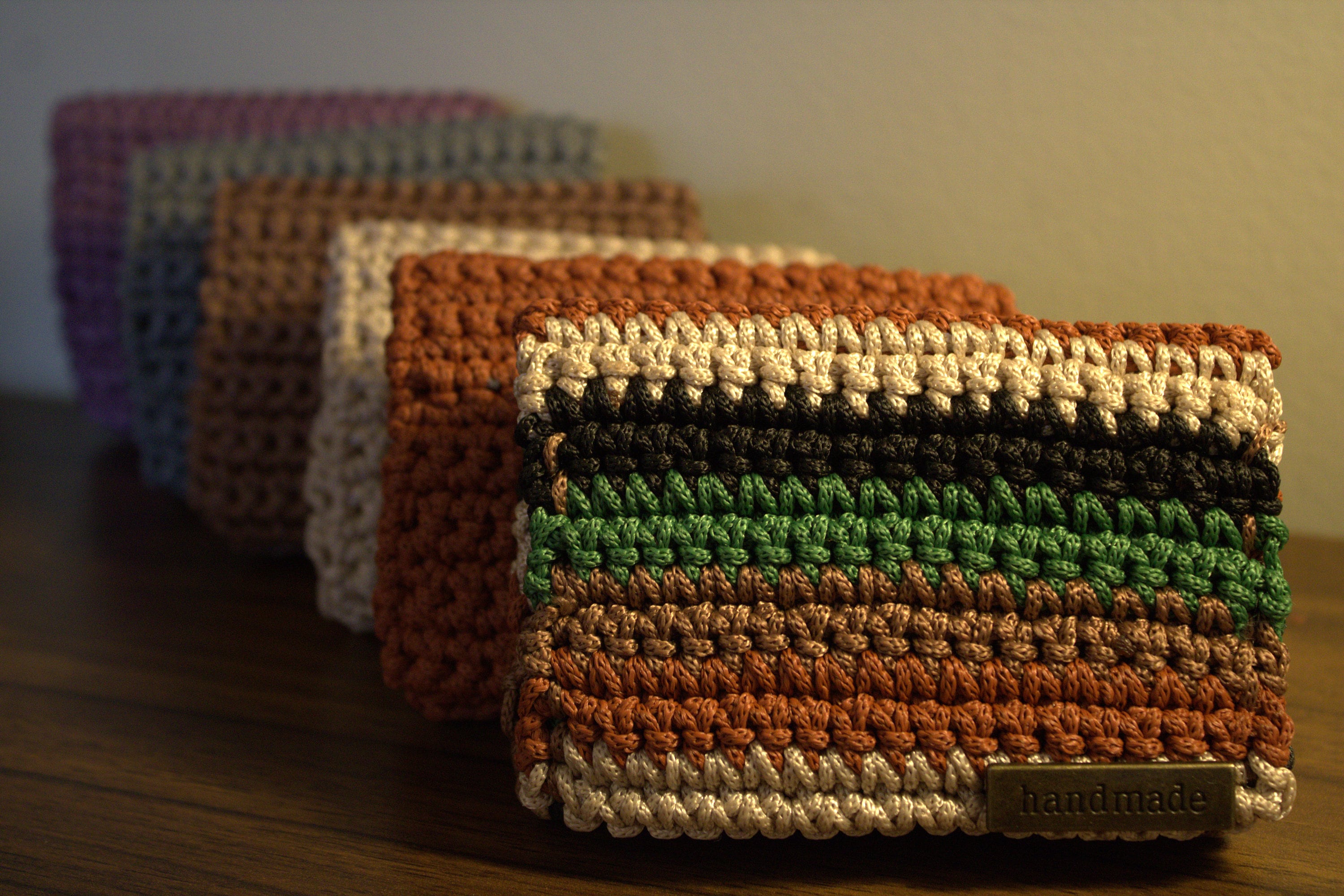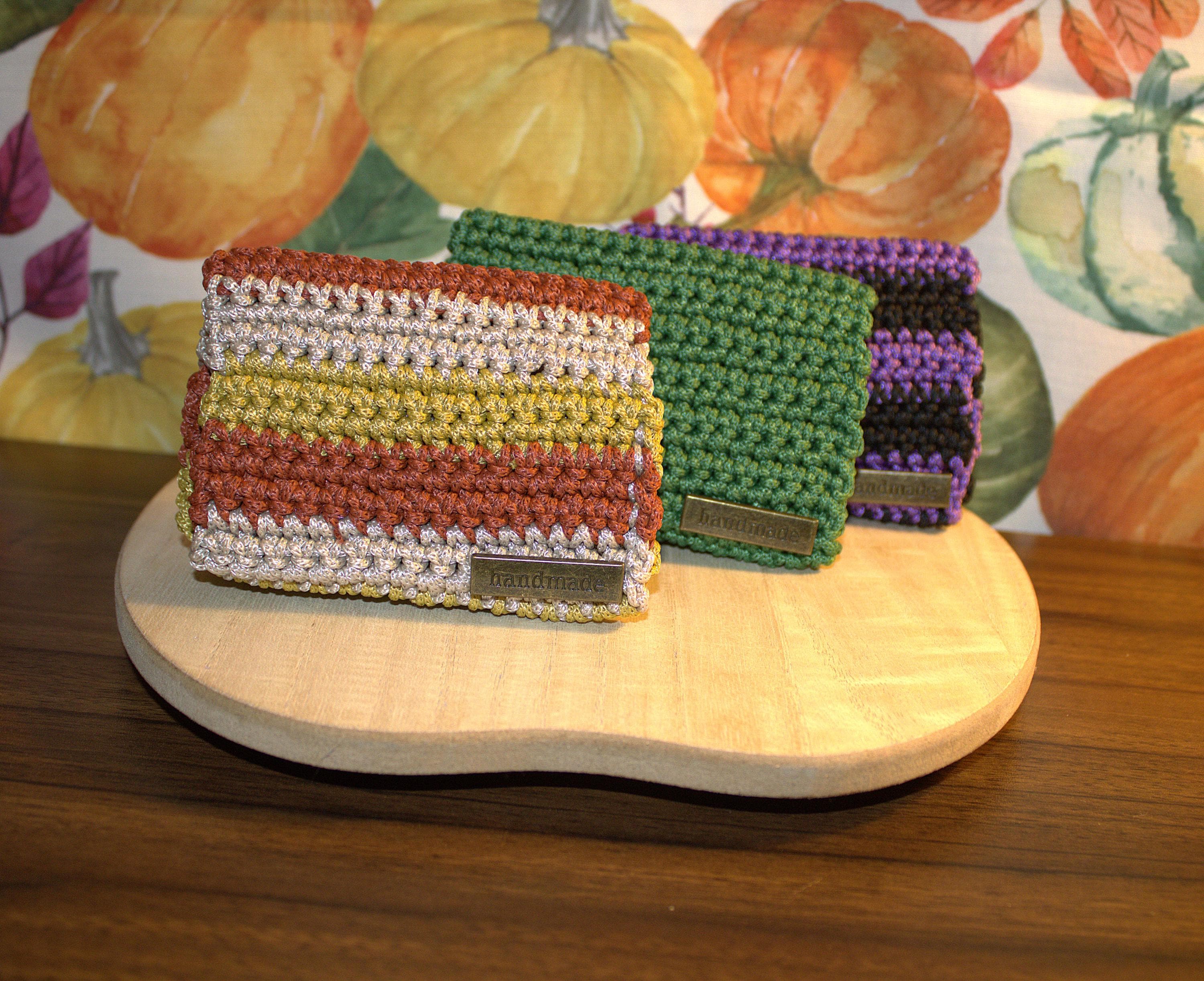 This wallet is handmade with sturdy polyester cord for sturdy, long lasting use, a powerful metal clasp on the inside for a secure hold, and a matching brass "handmade" bar on the front.