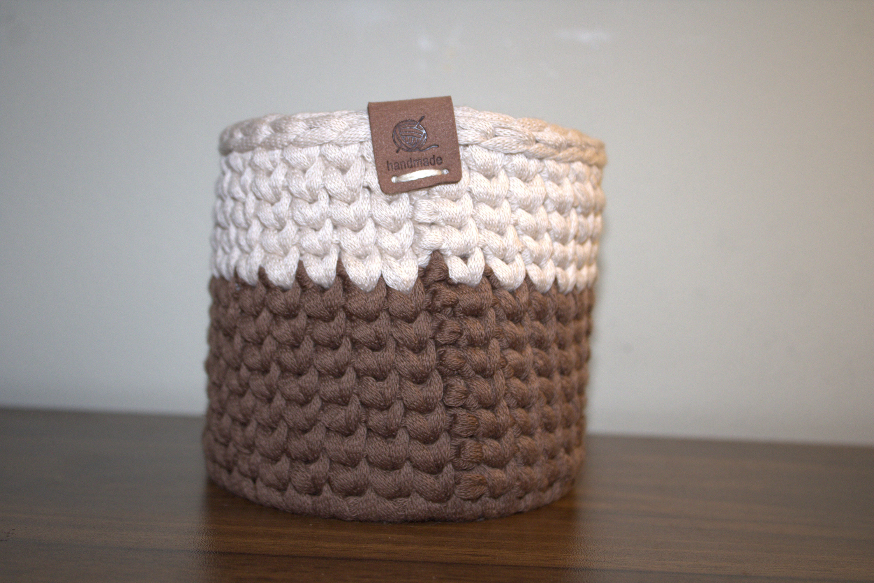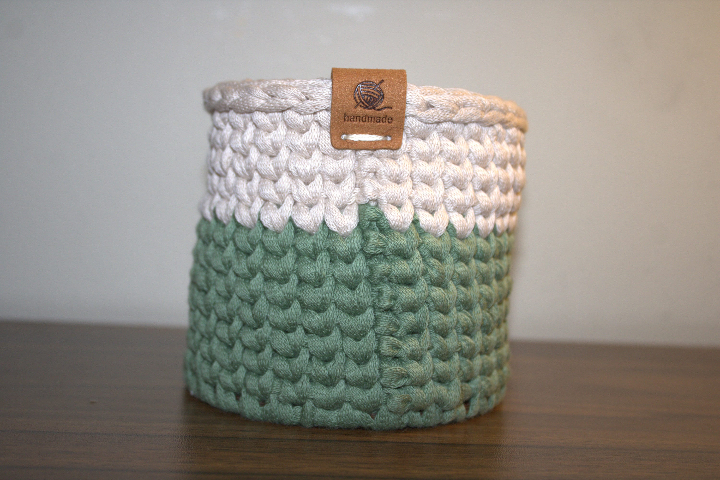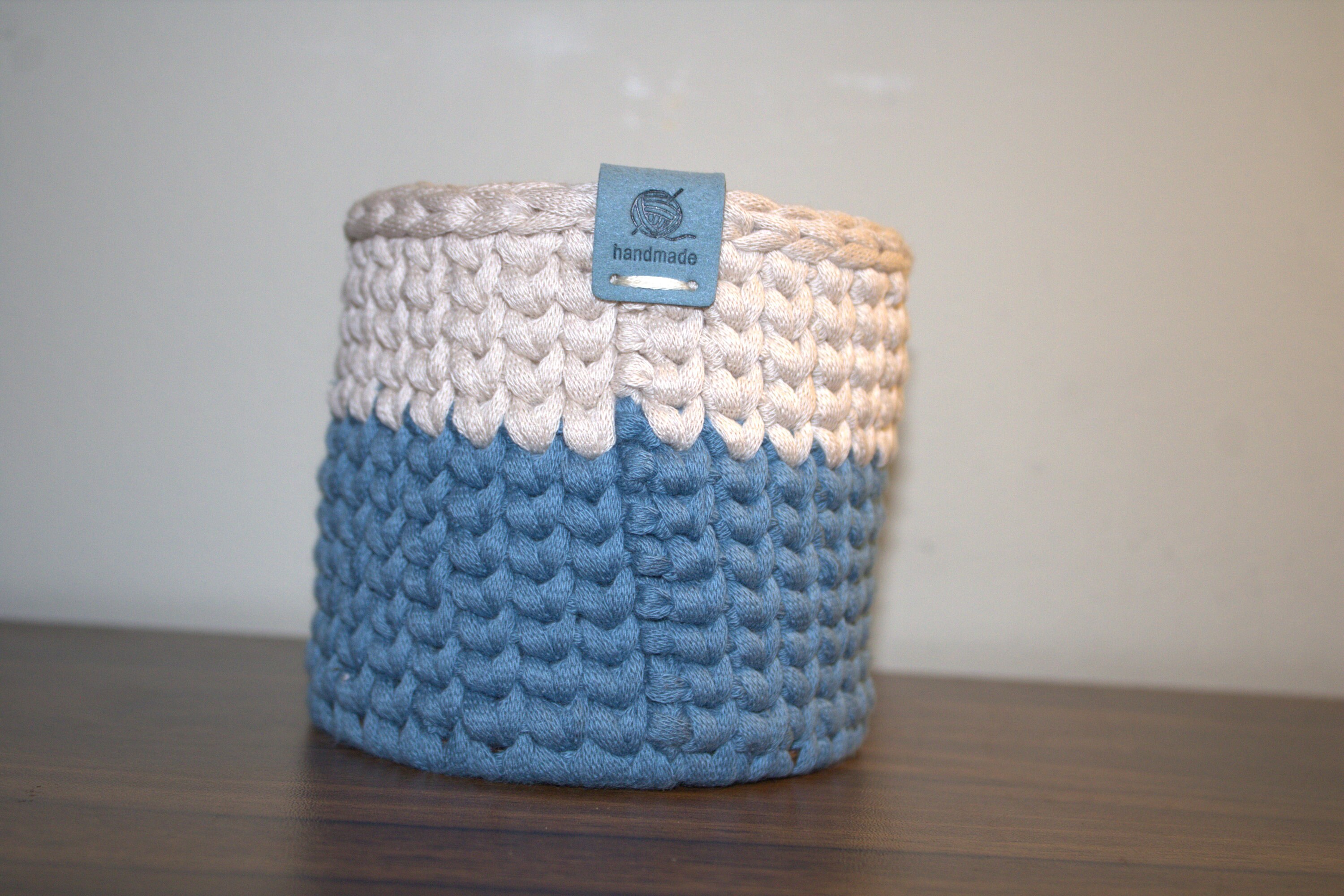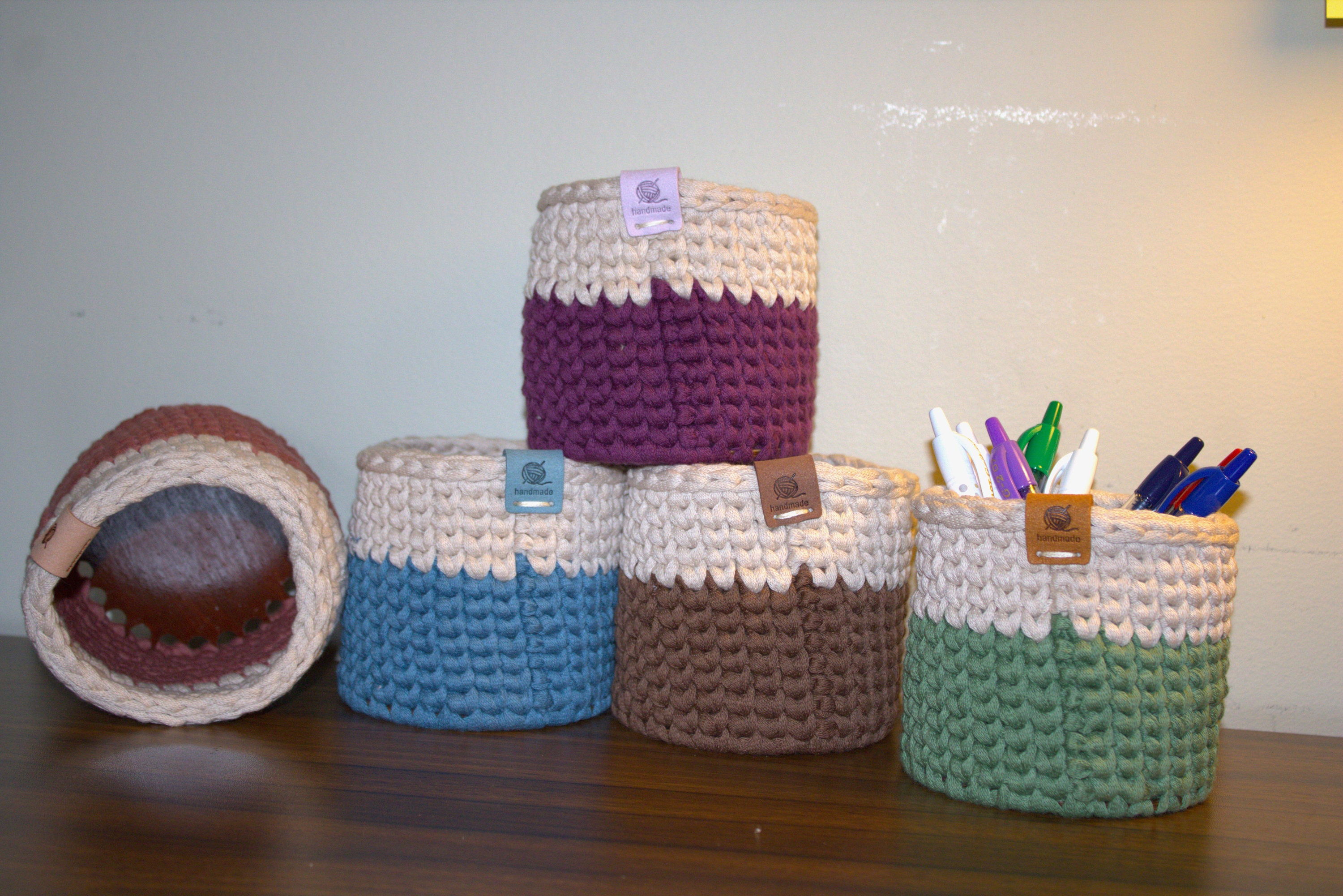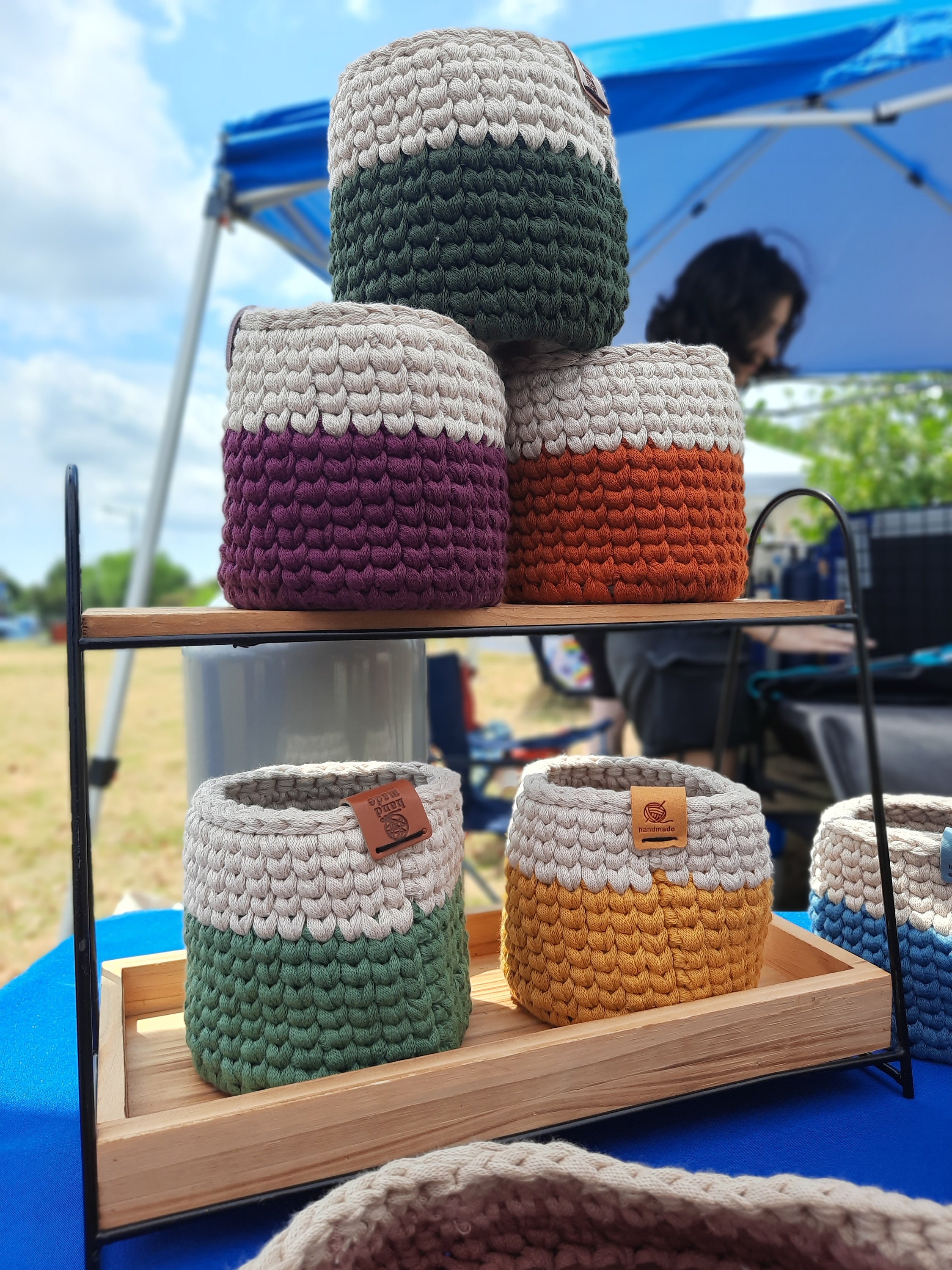 These handmade crochet baskets are the perfect addition to your bathroom, desk, kitchen, or shelf. The simple yet elegant design provides a pop of color. With a customizable hand wood-stained bottom, this basket's variety of colors is sure to fit your aesthetic!