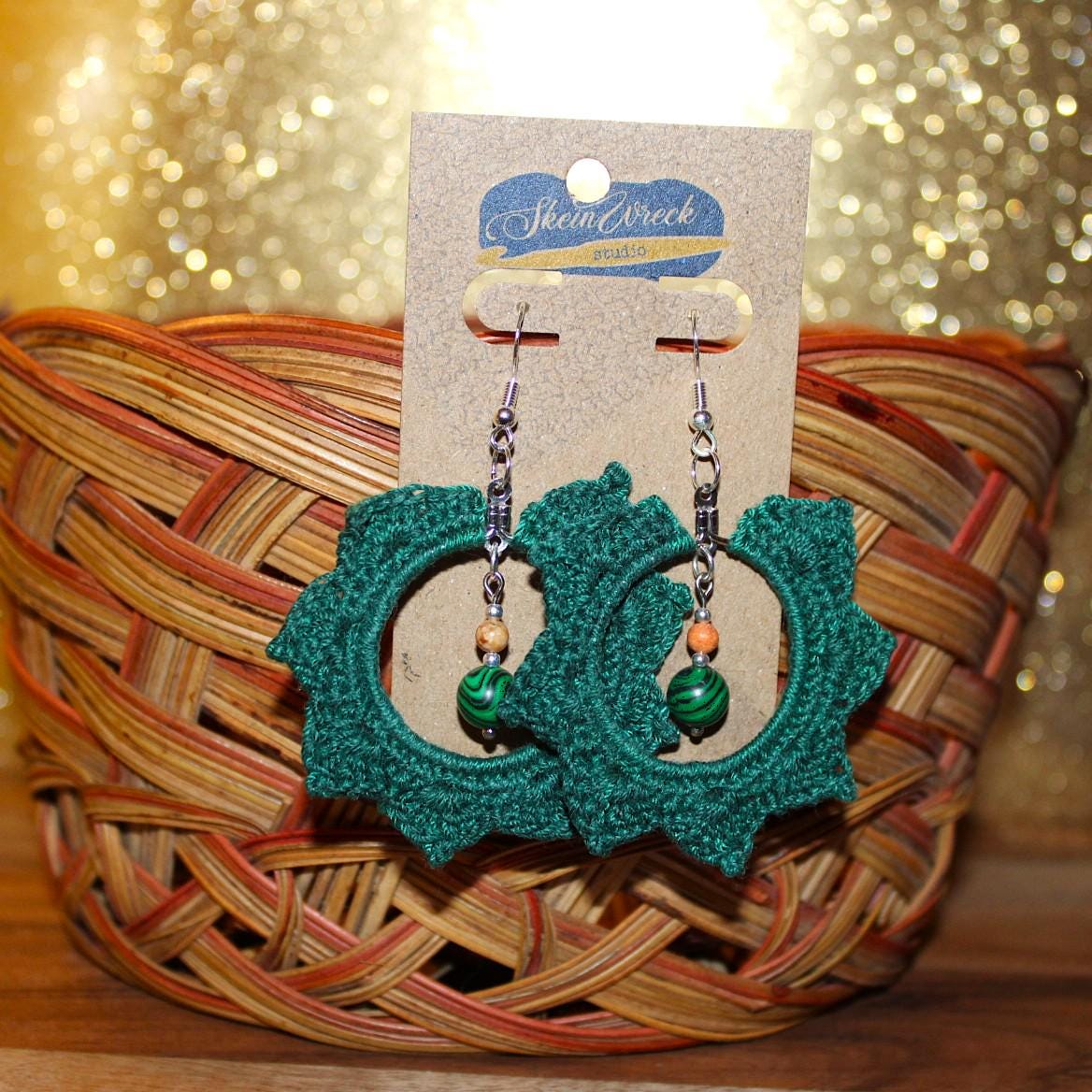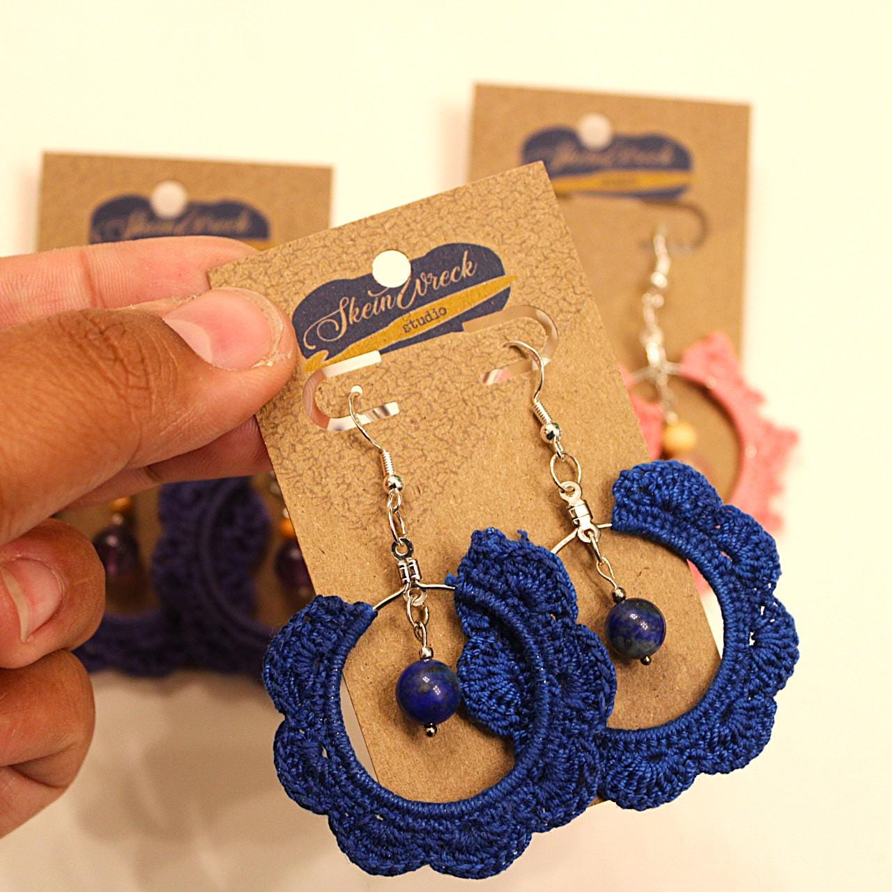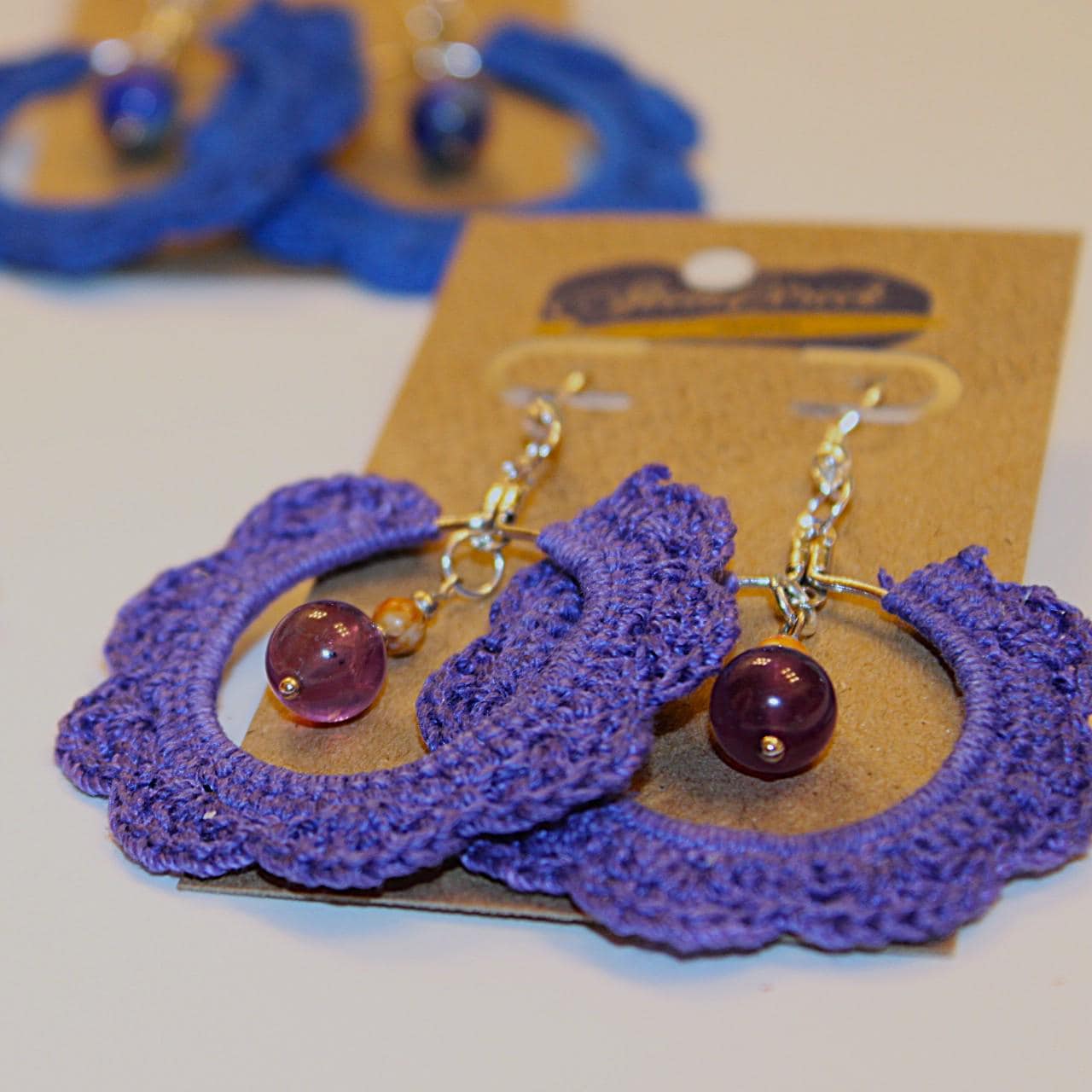 Each pair was designed and crafted by Cecily. The thread is carefully crocheted into the flower, taking anywhere from 30min-1hr to crochet each pair. They're then carefully stiffed with a paintbrush using a water-resistant stiffing agent to increase durability and reduce potential water damage, and then carefully dried before assembly. Each pair is made with love, care, and attention.