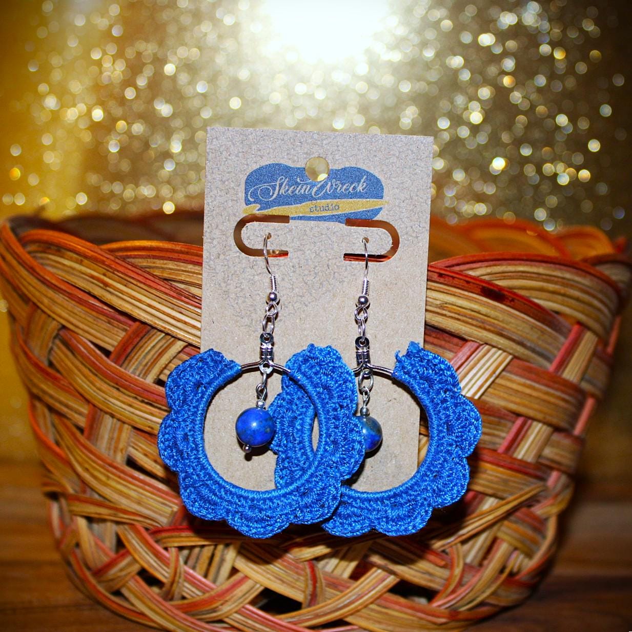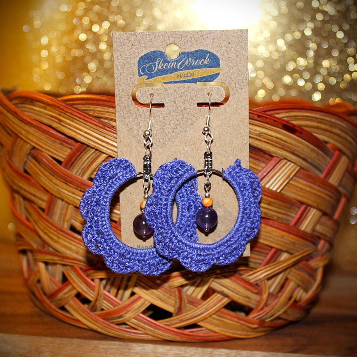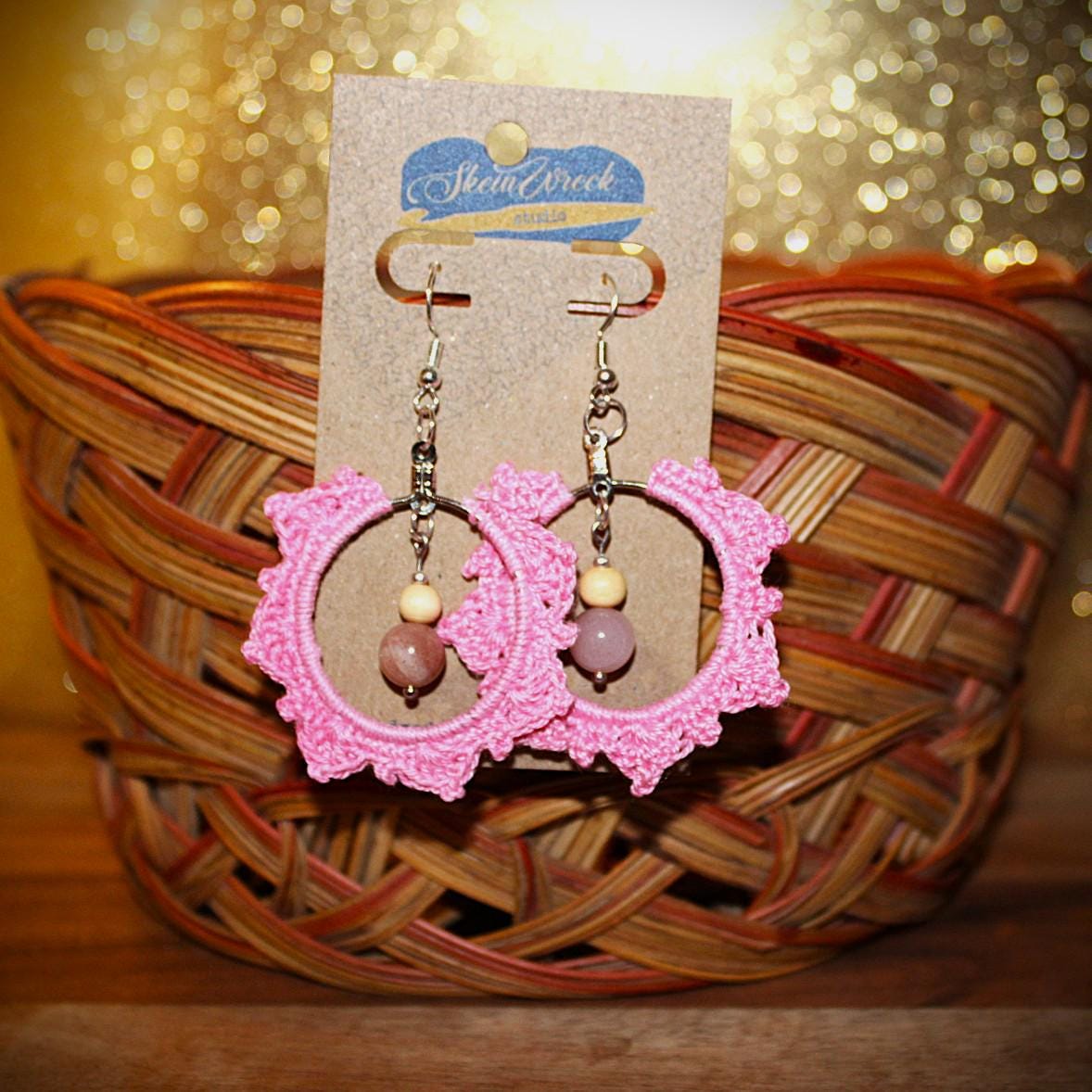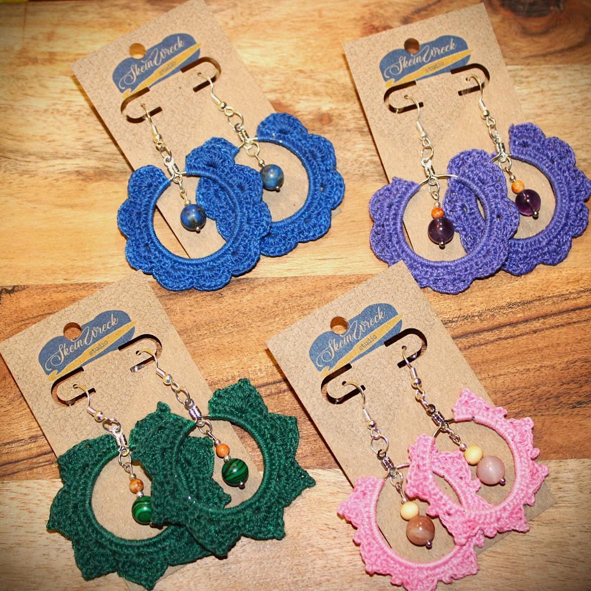 You've never seen earrings done like this before! Each gemstone has a unique crochet pattern that was uniquely designed with an interpretation of the energy that it provides. The different stones that dangle in the middle of the aluminum frame are paired with silver and petrified wood beads for a gentle, elegant touch.
